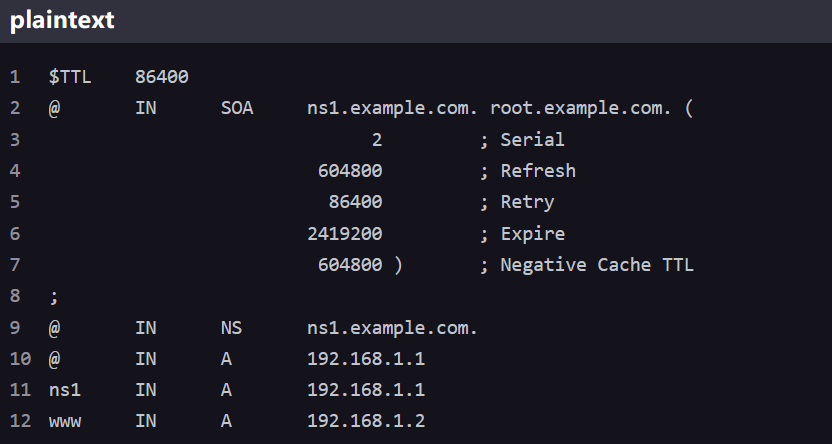 区域文件定义了DNS区域的记录。以配置一个正向解析区域为例,可以创建一个名为db.example.com的文件,并放入以下内容: